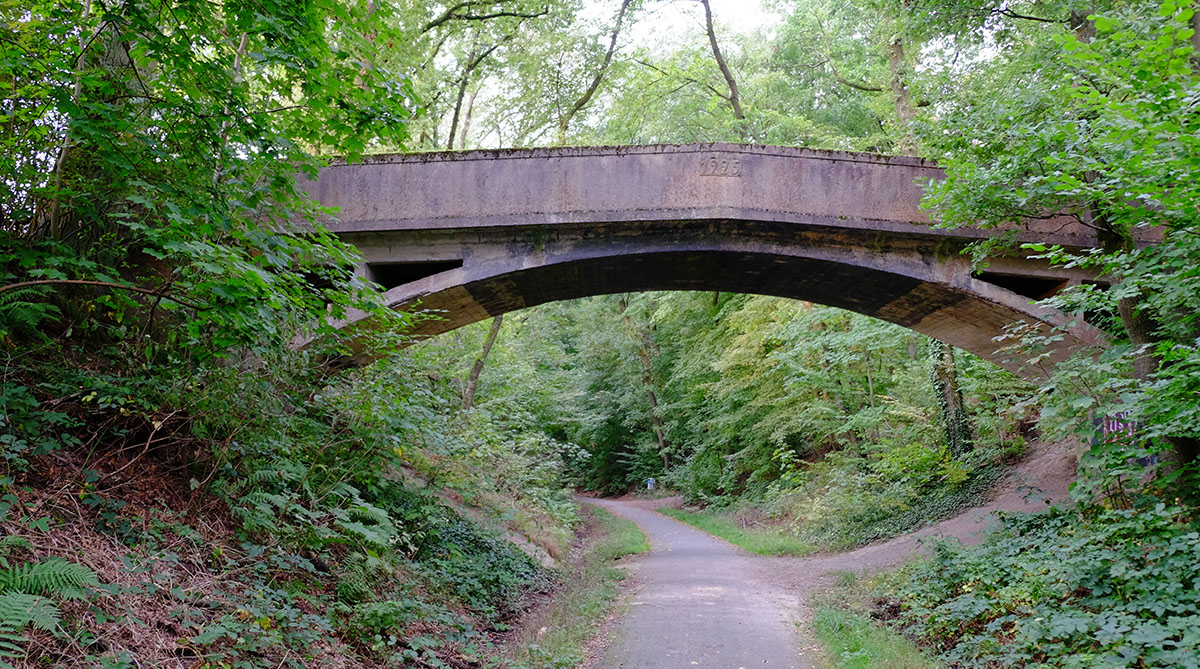 Nach dreijähriger Bauzeit fuhr vom April 1900 an bis Februar 1955 über diesen Bahndamm eine Kleinbahn. Die Strecke reichte mit einer Spurbreite von 1 m von Enger nach Bielefeld und war 15,4 km lang. Die kleinen Dampflokomotiven zogen sowohl Passagier- als auch Güterwagen. In den 1950er Jahren verlor die Kleinbahn den Wettbewerb gegen Bus und PKW, der Fahrbetrieb wurde eingestellt, die Gleise abgebaut. Der Damm ist in den hier sichtbaren Resten und am Enger Bruch zu erkennen. Teile des Bahndamms sind strukturreiche Biotope für Vogelarten, Schmetterlinge, Heuschrecken und anderen Insekten.