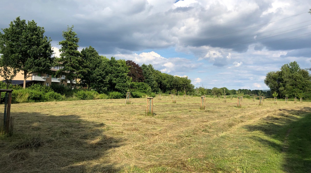 2018 wurde ganz im Westen des Füllenbruchs eine neue Streuobstwiese angelegt. Dieser früher häufige, bäuerlich genutzte Lebensraum ist sehr selten geworden. Mit zahlreichen Neuanpflanzungen versucht die Biologische Station diesem Trend entgegenzuwirken. Es wurden 32 Bäume mit regional typischen Hochstammsorten gepflanzt.