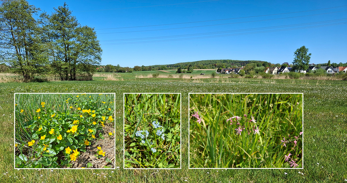 An dieser Stelle befindet sich eine besonders artenreiche Feuchtwiese, wissenschaftlich „Sumpfdotterblumen-Wassergreiskraut-Wiese“ genannt. Diese und auch andere Arten auf der Fläche sind auf feuchte, später gemähte und wenig gedüngte Standorte angewiesen. Besonders schön ist der Anblick im Frühsommer, wenn die zart-violetten Blüten der Kuckucks-Lichtnelke hundertfach dicht an dicht stehen und das Sumpf-Vergissmeinnicht unscheibar blüht.