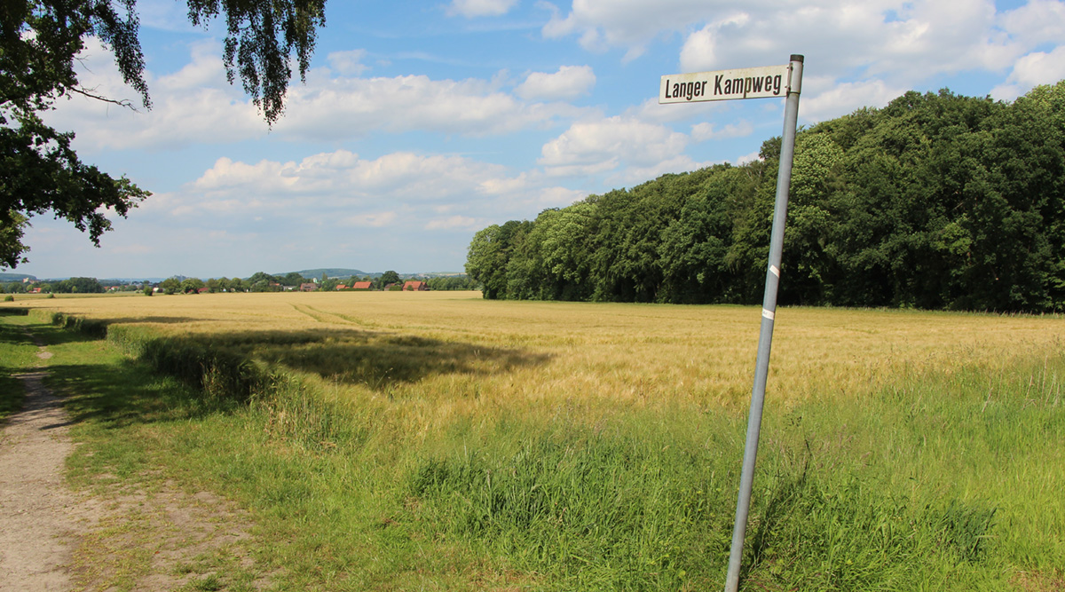 Der Weg vom Friedhof führt über große Felder, die „Langer Kamp“ heißen. „Kamp“ ist eine ortsübliche Bezeichnung für Ackerlagen, die meist höher liegen als die feuchten Wiesen an den Bachläufen. Die Äcker sind oft wie ein Uhrglas noch oben gewölbt und viele Ortsbezeichnungen und Familiennamen tragen „Kamp“ im Namen.