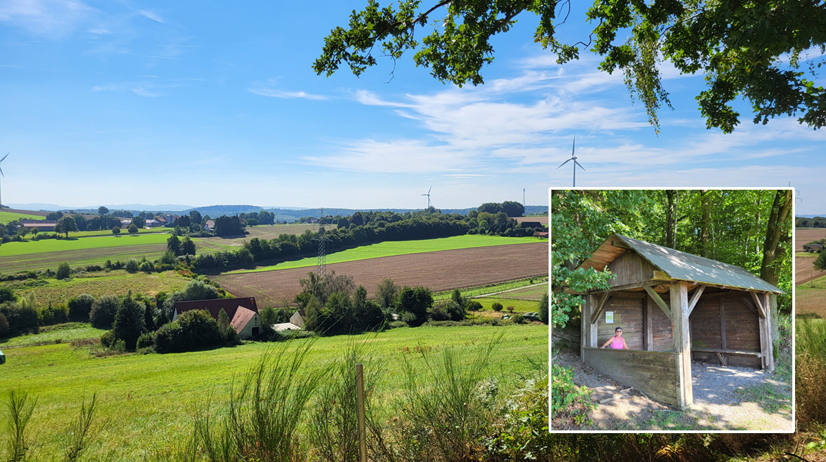 Am Südhang des Höhenzuges Egge befindet sich diese kleine Schutzhütte mit einem herrlichen Rundblick. In südöstlicher Richtung fällt der Blick zunächst auf den Solterberg mit seiner markanten Windkraftanlage und weiter nach Westen bis Bad Salzuflen-Wüsten mit ähnlichen Anlagen. Weiter nach Süden und Westen folgt das Waldstück Hollenhagen und daneben liegt der Stuckenberg mit dem Herforder Stadtwald. Vor dem Panorama direkt hinter der Autobahn A2 und Kreisstraße K12 liegt der Kipshagen in Vlotho-Exter.