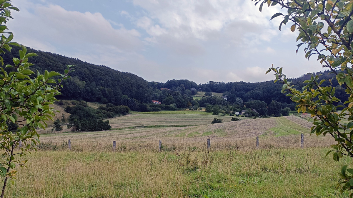 Von dieser Stelle aus blickt man in Richtung Weser, die nur 2 Kilometer entfernt ist. Bei klarer Sicht ist das Wesergebirge, die östliche Fortführung des Wiehengebirges, gut zu erkennen. Am 4.10.1638 kam es im 30-jährigen Krieg am Voßgrund zur „Schlacht von Valdorf“. Schwedische Truppen lagerten vor Lemgo. Um die Stadt vor dem Zugriff zu retten, eilten kaiserliche Soldaten nach Ostwestfalen. Die feindlichen Truppen wollten bei Vlotho über die Weser gehen, um sich Richtung Minden zurückzuziehen. Dies wurde durch die Zerstörung der Brücke verhindert und die Schweden zwischen Werre und Weser eingeklemmt. In der Nähe der Valdorfer Kirche beteiligten sich über 15.000 Soldaten an einer dreistündigen Schlacht, über 1.000 Menschen fanden den Tod. Der General James King, ein schottischer Söldner im Dienst der Schweden, schrieb in einem Bericht: "wobei die Hecken und Büsche dem Feinde zustattenkamen".