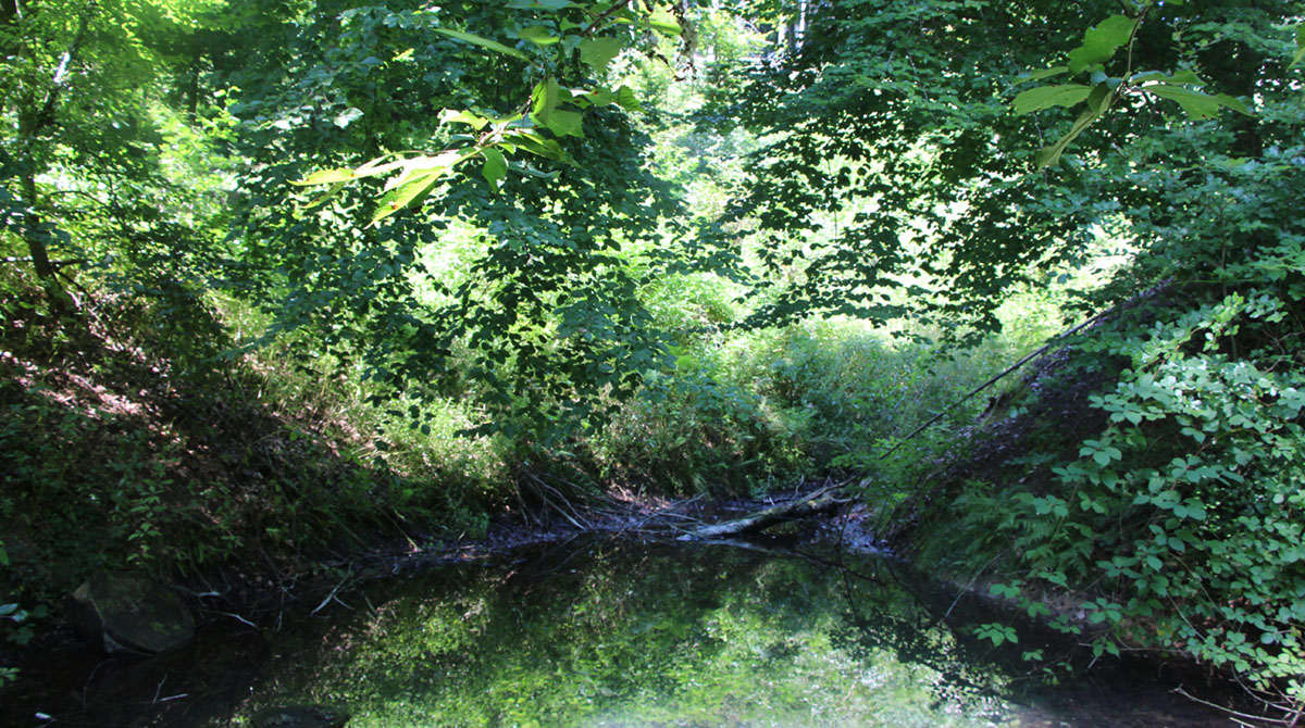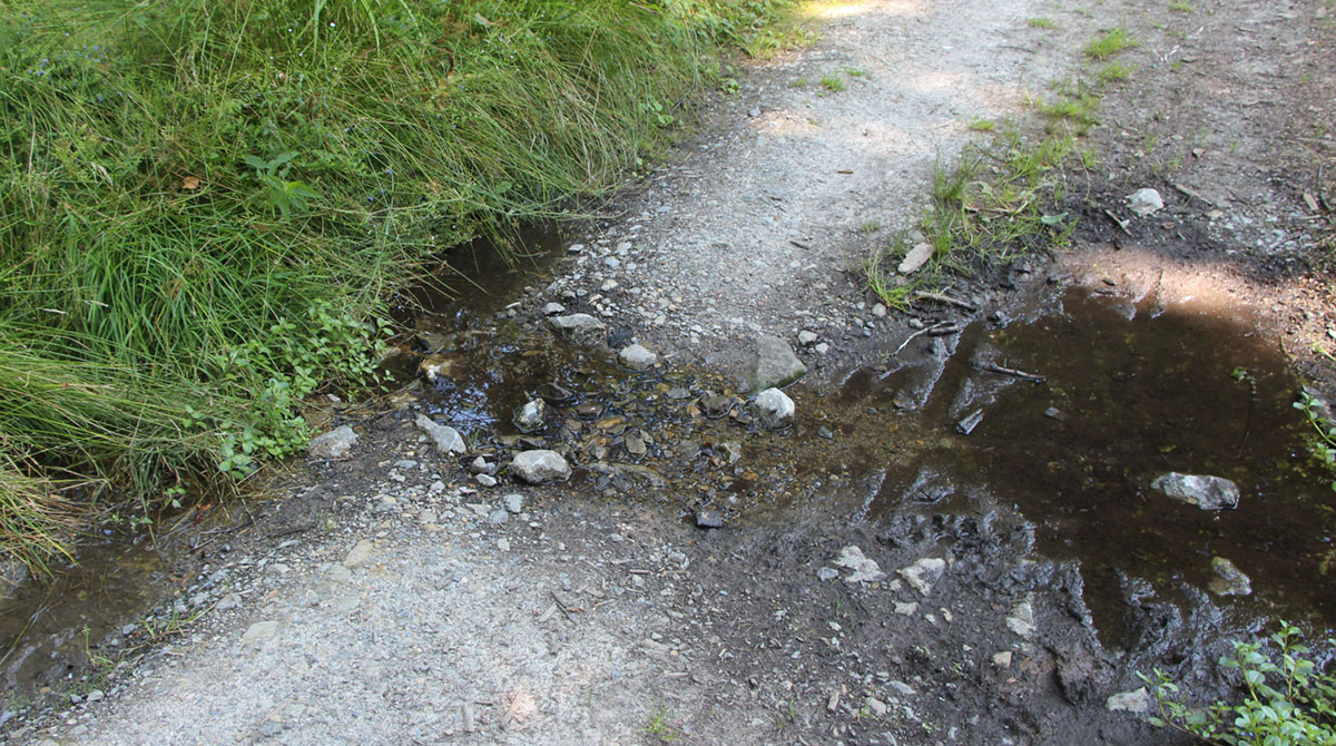 In einem Bach leben viele Tiere, die im Gewässer auf und ab wandern - Fische, Krebse, Libellen- und Köcherfliegenlarven. Wege und Straßen mit Verrohrungen erschweren diese Wanderungen erheblich, die für Ausbreitung, Nahrungssuche und Fortpflanzung der Arten unentbehrlich sind. Im Naturschutzgebiet wurden einige Rohre entfernt und der Bach freigelegt. Eine stabile Steinlage dient als Furt und kann problemlos durchfahren oder durchwandert werden, wenn auch nicht immer trockenen Fußes. In Naturschutzgebieten hat die Natur Vorrang und festes Schuhwerk ist in der Landschaft nie verkehrt.