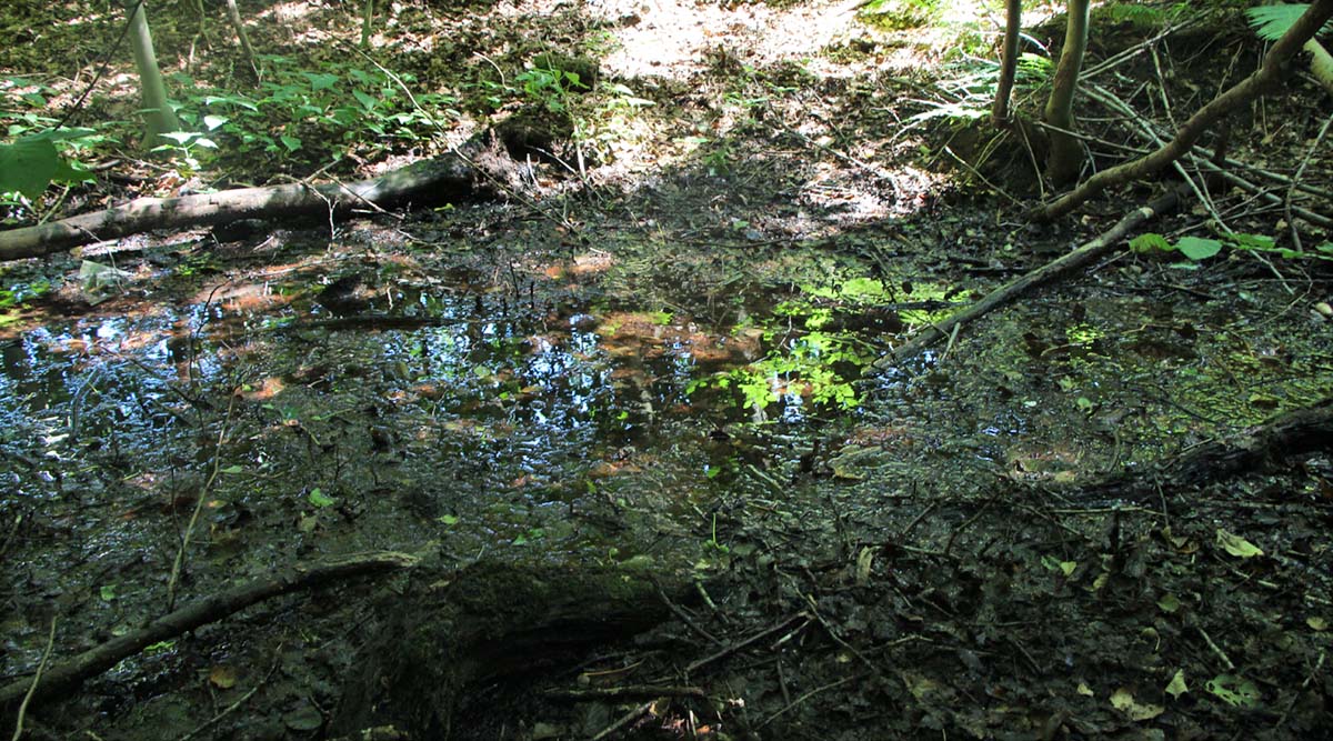 Aufgrund des hohen Grundwasserspiegels bilden sich kleine Tümpel und sumpfige Wälder aus überwiegend Erlen. Diese Erlenbruchwälder sind Rückzugsgebiete für viele Tiere, in erster Linie Amphibienarten wie Kammmolch und Feuersalamander. Typisch für das Gebiet sind die vielen Larven der Feuersalamander, die das klare Wasser der Quellen bevorzugen.