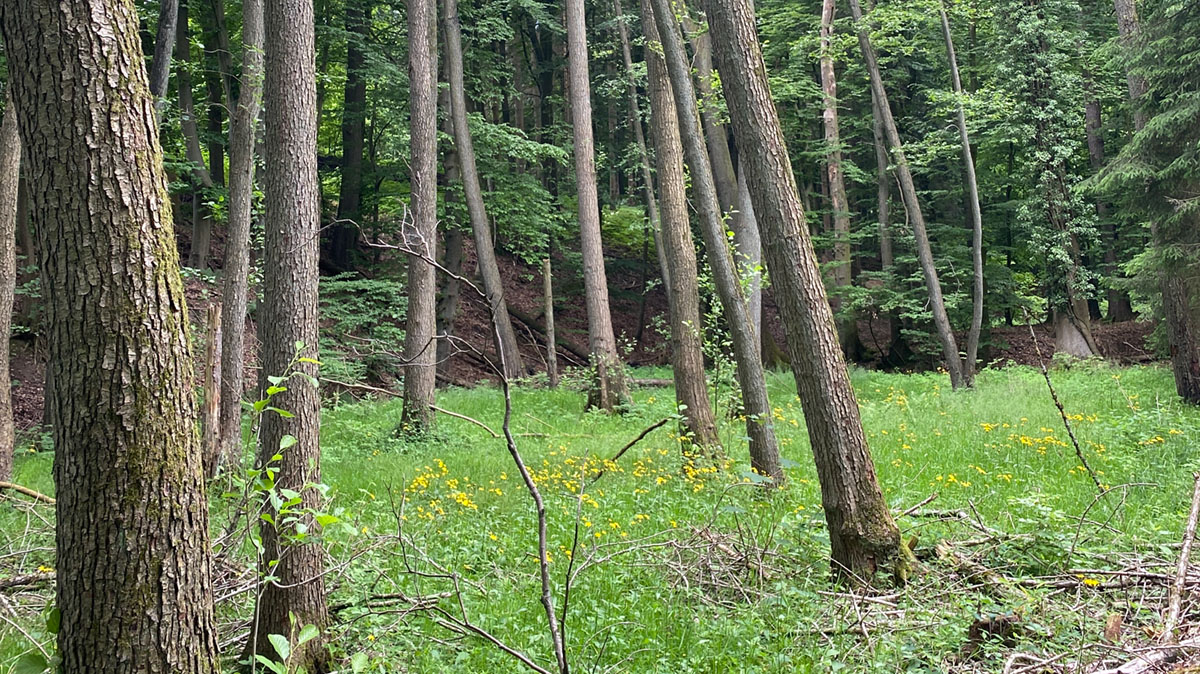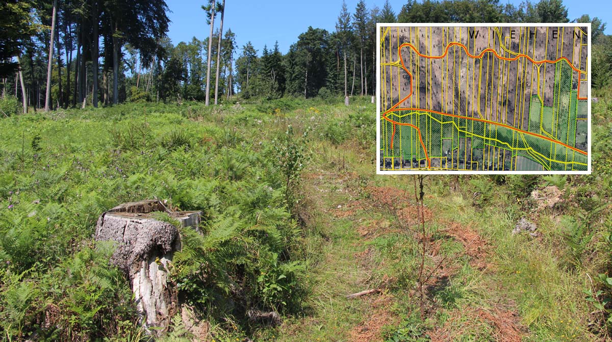 Viele Nadelbäume sind in den letzten Jahren abgestorben und ein junger Mischwald wird nachgepflanzt. Dieser entwickelt sich hoffentlich zum Wald mit Zukunft.