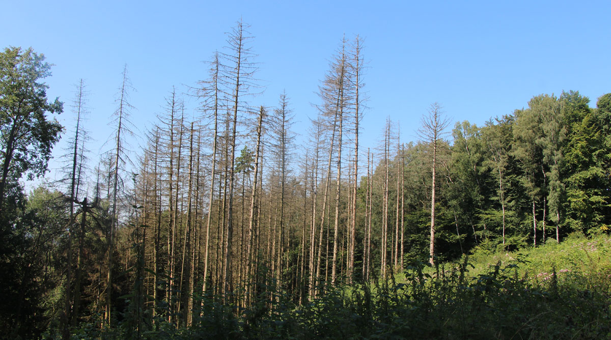 Vom Südhang des Höhenzuges sind neuerdings vermehrt weite Blicke in die Landschaft möglich geworden, da viele Fichten abgestorben sind.
