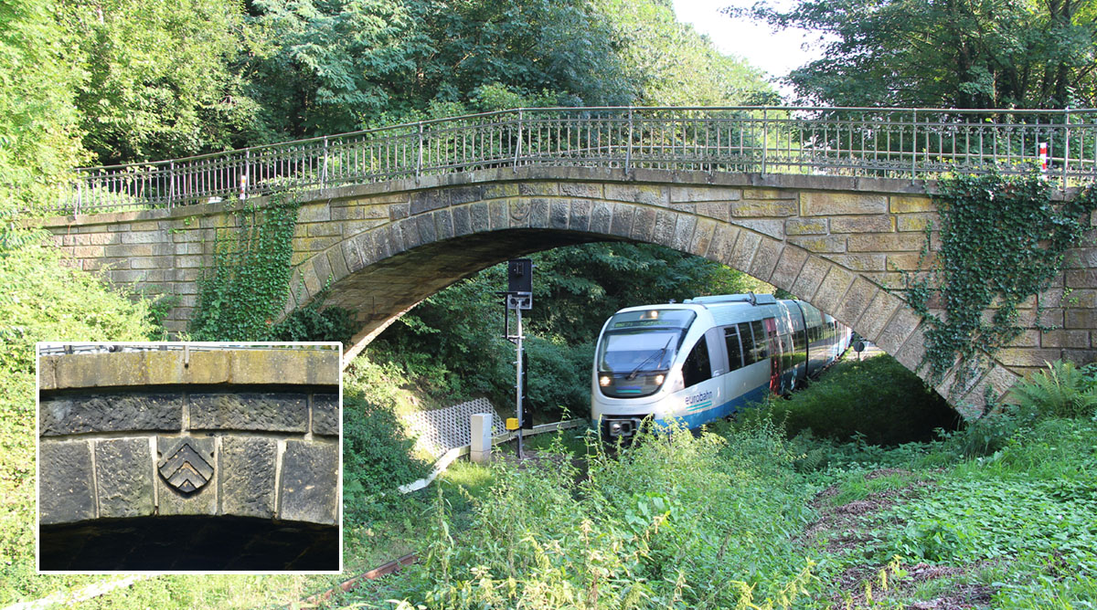 Die Eisenbahnbrücke „Neue Mühle“ wurde zusammen mit der Eisenbahnlinie von Bünde über Lübbecke nach Bassum am 30.9.1899 eingeweiht. Die Bahnstrecke durchschneidet das Wiehengebirge. Weiter südlich verlaufen die Schienen auf einem Damm. Dieser trennt das Auebachtal vom Wald der Donoer Berge. Das Bachbett der „Großen Aue“ wurde nach Westen verlegt. Die Brücke präsentiert sich heute noch in ihrem Originalzustand. Der aus gestampftem Lehm und Schotter bestehende Weg über die Brücke ist erhalten geblieben, ebenso das schmiedeeiserne Geländer. Aus großen Sandsteinquadern gebaut, ziert den südlichen Schlussstein das Ravensberger Wappen mit den drei Sparren. Auf der Nordseite sieht man zwei gekreuzte Schlüssel, Symbol für das angrenzende Fürstbistum Minden. 1986 wurde der planmäßige Halt an der Brücke aufgegeben und eine Bedarfshaltestelle eingerichtet.