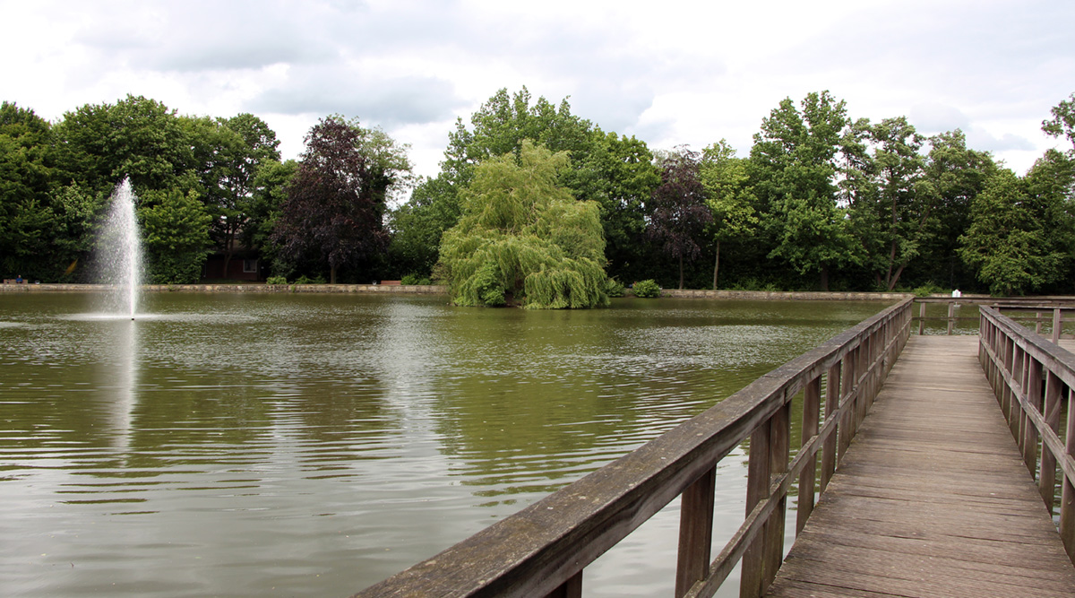 Der Zigarrenfabrikant August Steinmeister gründete 1880 die Bünder Fischzuchtanlagen. 38 Teiche wurden angelegt, mit dem Wasser des Gewinghausener Baches gespeist. Gezüchtet wurden Lachs, Hecht und Forellen, die deutschlandweit verkauft wurden. Die Fischzucht wurde Anfang des 20. Jahrhunderts aufgegeben, den größten Teil der Anlage erwarb die Stadt Bünde. 1936 wurde hier die Bünder Badeanstalt gebaut. Der größte Fischteich wurde neugestaltet und liegt heute im Zentrum des Steinmeister Parks.