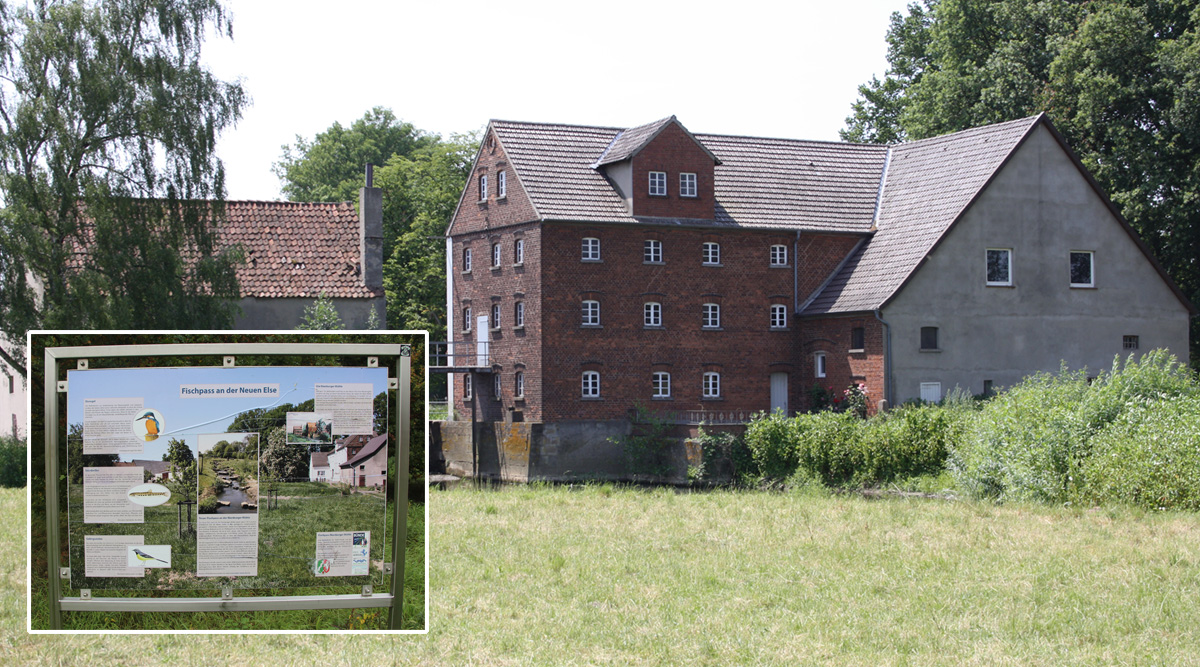 An der Nienburger Mühle besteht in der Neuen Else ein 1,10 m hoher Absturz. Damit ist die für ein naturnahes Fließgewässer bedeutsame Durchgängigkeit vollständig unterbrochen. Zahllose Bachtiere nutzen die unterschiedlichen Strukturen der Gewässerabschnitte für überlebenswichtige Ortswechsel, je nach Jahres- oder sogar Tageszeit. Sohlabstürze, Verrohrungen und Stauwehre sind unüberwindbare Hindernisse. Die stromaufwärts liegenden Gewässerabschnitte gehen als Lebensraum für viele Arten verloren. Um die Höhendifferenz an der alten Wassermühle zu überbrücken, wurde ein rund 60 m langer Fischpass gebaut. Findlinge und querliegende Baumstämme wurden als Querbauwerke eingebaut. In den so entstandenen Kammern werden jeweils 10 cm Höhendifferenz abgebaut. Über diese kleinschrittigen Unterabschnitte gelingt es vor allem Fischen besser, gegen die Fließrichtung aufzusteigen.