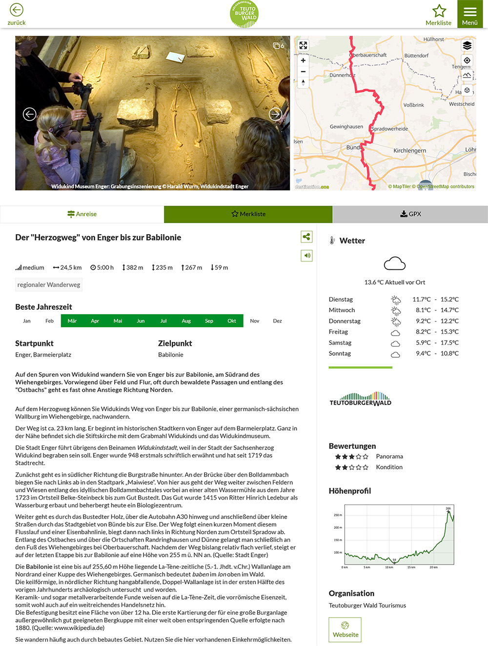 Weiter geht es durch das Bustedter Holz, über die Autobahn A30 hinweg und anschließend über kleine Straßen durch das Stadtgebiet von Bünde bis zur Else. Der Weg folgt einen kurzen Moment diesem Flusslauf und einer Eisenbahnlinie, biegt dann nach links in Richtung Norden zum Ortsteil Spradow ab. Entlang des Ostbaches und über die Ortschaften Randringhausen und Dünne gelangt man schließlich an den Fuß des Wiehengebirges bei Oberbauerschaft. Nachdem der Weg bislang relativ flach verlief, steigt er auf der letzten Etappe bis zur Babilonie auf eine Höhe von 255 m ü. NN an. (Quelle: Stadt Enger)