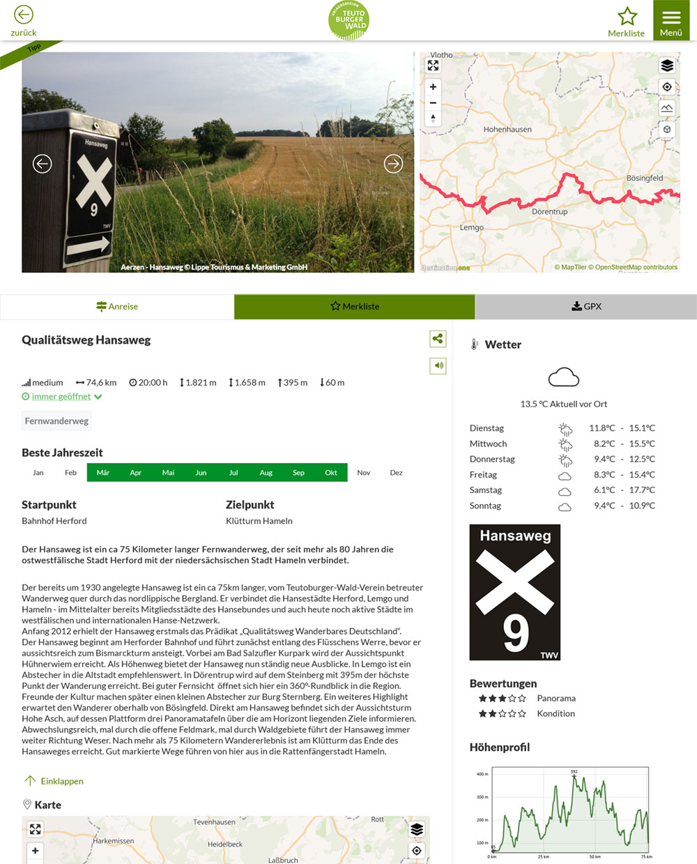 Ein weiteres Highlight erwartet den Wanderer oberhalb von Bösingfeld. Direkt am Hansaweg befindet sich der Aussichtsturm Hohe Asch, auf dessen Plattform drei Panoramatafeln über die am Horizont liegenden Ziele informieren. Abwechslungsreich, mal durch die offene Feldmark, mal durch Waldgebiete führt der Hansaweg immer weiter Richtung Weser.