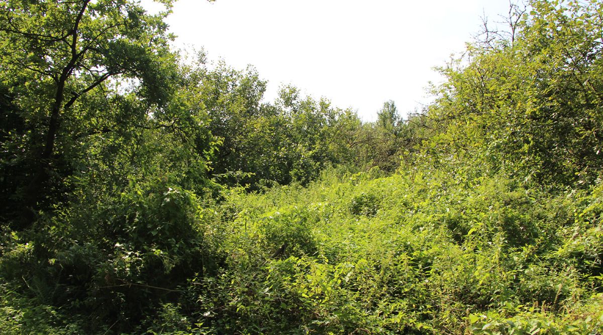 An den Torpfosten, überwachsenen Mauerresten und verwilderten Obstbäumen lässt sich erkennen, dass sich hier ein Bauernhof mit einem großen Obstgarten befand. Die schon lange nicht mehr gepflegten Bäume entlang des Weges lassen auf eine Obstbaumallee schließen. Nach Aufgabe der Hofstelle wuchsen Brennnesseln auf, Gehölze siedelten sich an und ein Schleier von Waldrebe und Brombeeren legte sich über die Fläche. Inzwischen ist ein undurchdringliches Gebüsch entstanden, die Natur hat sich ein Stück Landschaft zurückerobert.