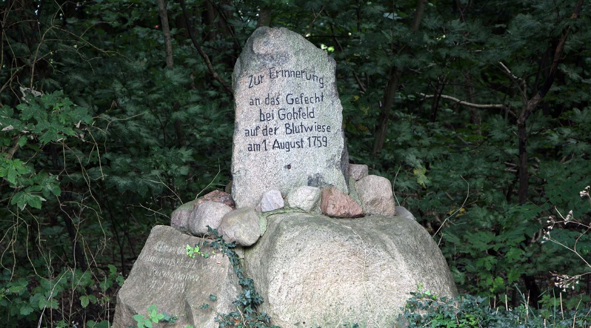 Im Siebenjährigen Krieg (1756-1763) gehörte die Grafschaft Ravensberg ebenso wie das Bistum Minden zu Preußen. Um die Festung in Minden hatten sich im Sommer 1759 zahlreiche Truppen konzentriert, an die 100.000 Soldaten aus Frankreich und Preußen. Am 1. August begann der Angriff der Preußen, die Schlacht führte zur völligen Niederlage der Franzosen. Der Erbprinz Karl von Braunschweig übernahm die Aufgabe, eine französische Sicherungstruppe bei Gohfeld zu zerschlagen. Seine 10.000 Mann bezogen östlich von Stift Quernheim Stellung. Die Franzosen standen unter dem Kommando von Herzog de Brissac und hielten sich an der Werrebrücke beim früheren Haus Gohfeld auf. Der braunschweigische Erbprinz teilte seine Streitmacht in drei Teile und nahm die Franzosen in die Zange. Die Verluste der Franzosen waren beträchtlich, es wurden allein 300 Gefangene gemacht. Noch viel mehr Soldaten kamen ums Leben und „netzen die Wiesen mit ihrem Blut“. Die Blutwiese wurde als Grabstätte für die gefallenen Franzosen gewählt, wie Funde vor über 100 Jahren belegen. Ein Gedenkstein erinnert an die "Action bey Coofeldt“.