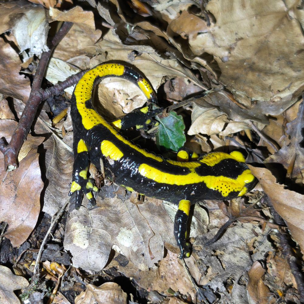 Zu den auffälligeren Bewohnern zählt der Feuersalamander. Er legt seine Larven in kleine Quellrinnsale und schattige Waldbäche, wo sie im kühlen Wasser heranwachsen. Seine knallige gelb-schwarze Zeichnung warnt Fressfeinde – und macht ihn zu einem Symbol intakter, feuchter Lebensräume.